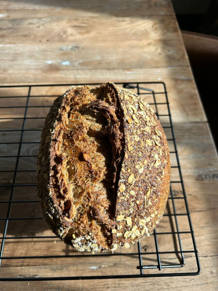 Een halfvolkoren speltbrood met een wat steverige kruim gevuld met zaden en pitten.