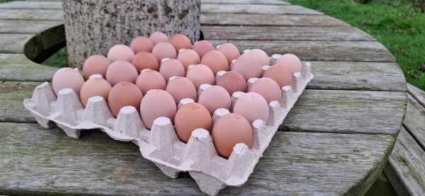 De eieren zijn biologisch gecertificeerd. Kijk bij Leveranciers Huize Wilp hoe deze kippen leven.